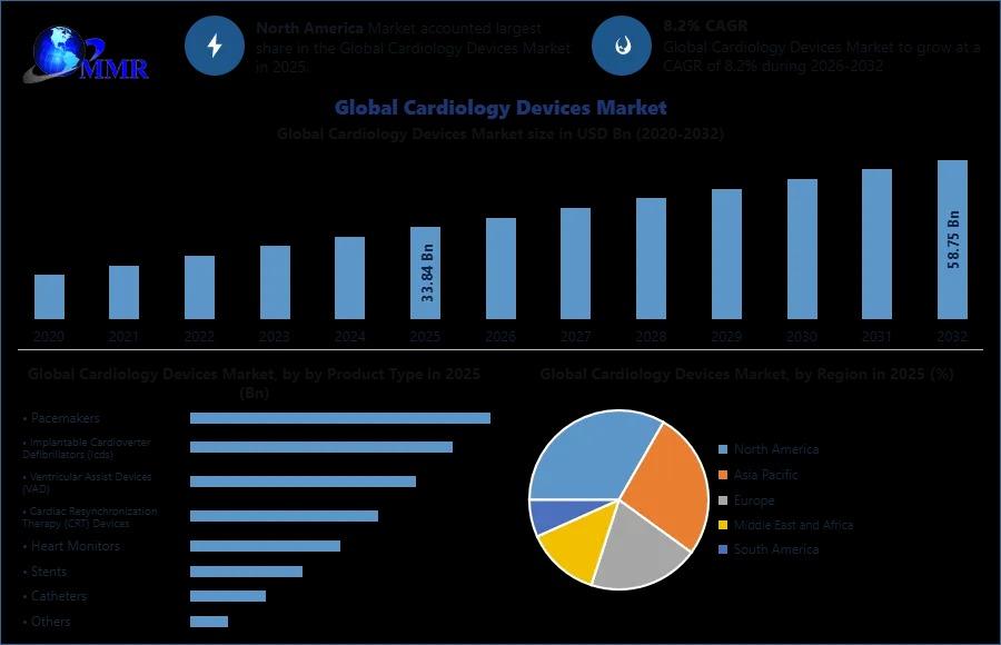 Anticipated Growth in Revenue: The Cardiology Devices Market size was valued at USD 33.84 Bn in 2025 and is expected to reach USD 58.75 Bn by 2032, at a CAGR of 8.2% during a forecast period.