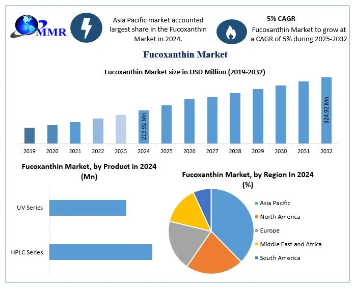 According to recent market assessments, the fucoxanthin market was valued at USD 219.92 million in 2024 and is expected to grow at a compound annual growth rate (CAGR) of 5% from 2025 to 2032, reaching nearly USD 324.92 million by 2032. This steady growth reflects rising demand for natural pigments, functional ingredients, and nutraceutical compounds worldwide.