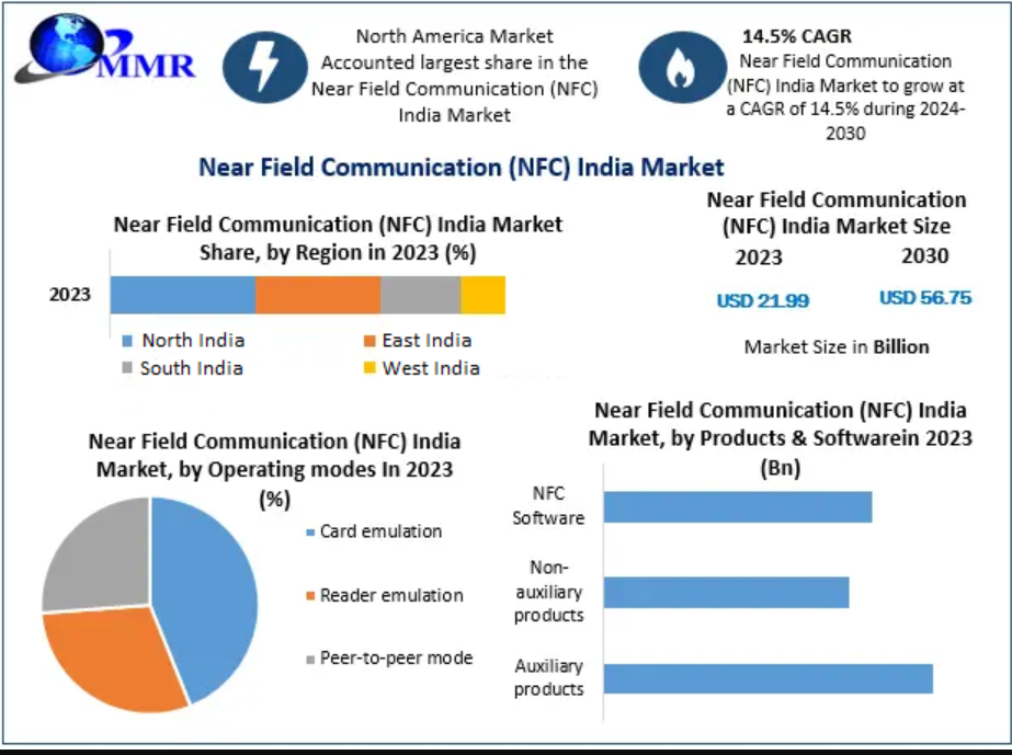 Near Field Communication (NFC) India Market is expected to grow at a CAGR of 14.5% during the forecast period. Near Field Communication (NFC) India Market is expected to reach US$ 56.75 Bn. by 2030.