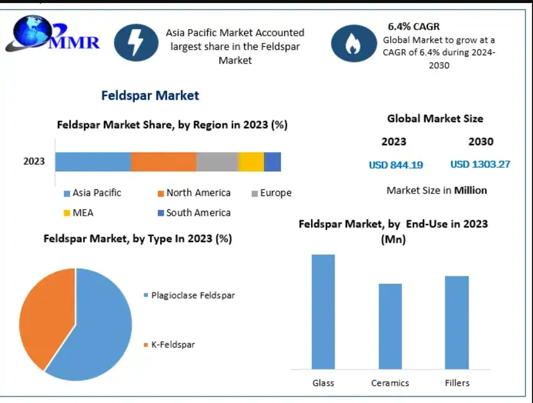 Feldspar Market was valued at USD 844.19 Mn in 2023 and is expected to reach USD 1303.27 Mn by 2030 at a CAGR of 6.4% during a forecast period.