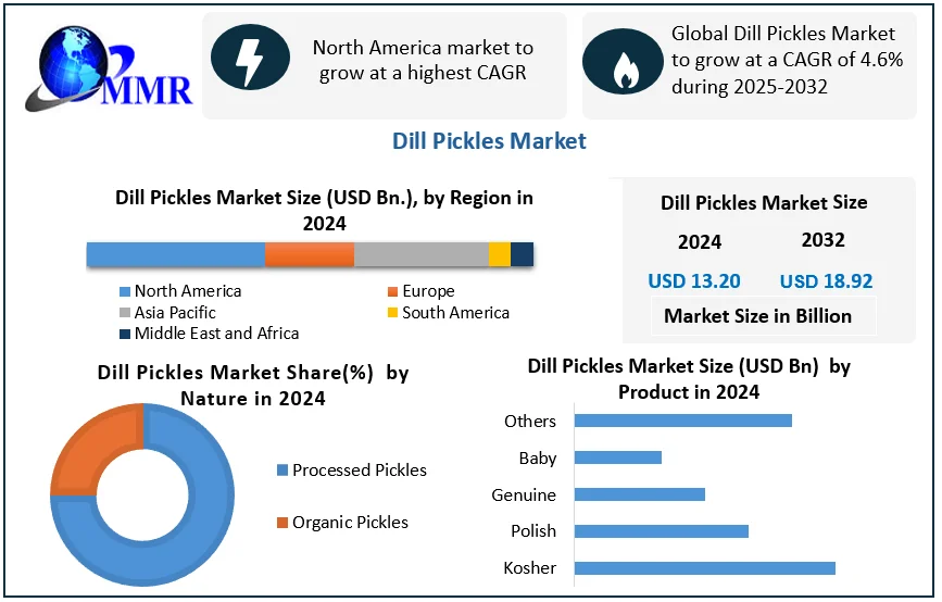 The Global Dill Pickles Market, valued at USD 13.20 billion in 2024, is projected to grow steadily at a CAGR of 4.6% from 2025 to 2032, reaching an estimated USD 18.92 billion by 2032. This sustained growth reflects the increasing popularity of dill pickles as a versatile condiment, snack, and functional fermented food across both retail and foodservice channels worldwide.