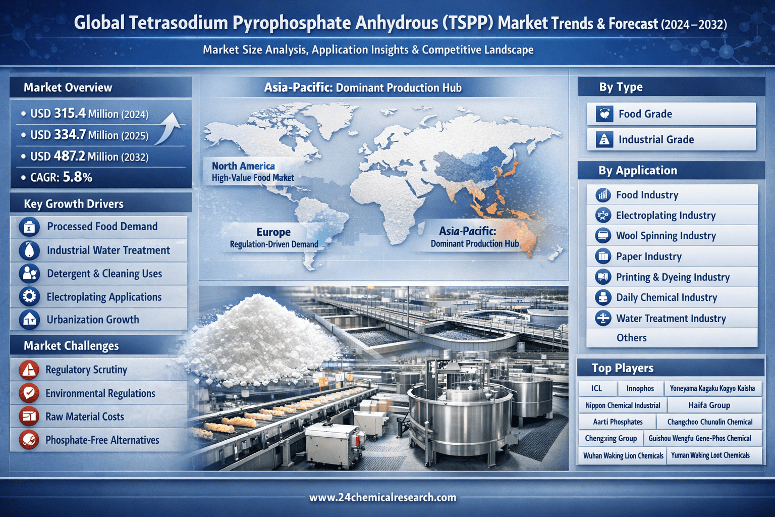 According to 24Chemical Research, Global Tetrasodium Pyrophosphate Anhydrous (TSPP Anhydrous) Market size was valued at USD 315.4 million in 2024. The market is projected to grow from USD 334.7 million in 2025 to USD 487.2 million by 2032, exhibiting a CAGR of 5.8% during the forecast period.