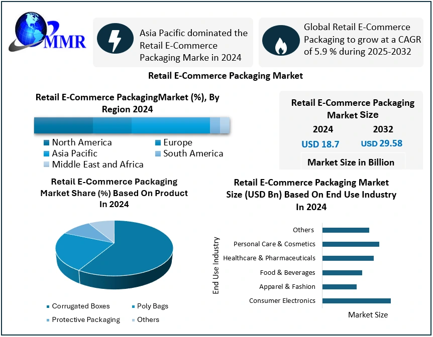 The Global Retail E-Commerce Packaging Market is witnessing steady growth as the rapid expansion of online retail continues to reshape packaging requirements worldwide. According to recent market insights, the Retail E-Commerce Packaging Market size was valued at USD 18.7 billion in 2024 and is projected to grow at a compound annual growth rate (CAGR) of 5.9% from 2025 to 2032, reaching nearly USD 29.58 billion by 2032. The increasing adoption of e-commerce platforms, rising consumer expectations for secure delivery, and the growing focus on sustainable packaging solutions are expected to significantly drive market growth in the coming years.