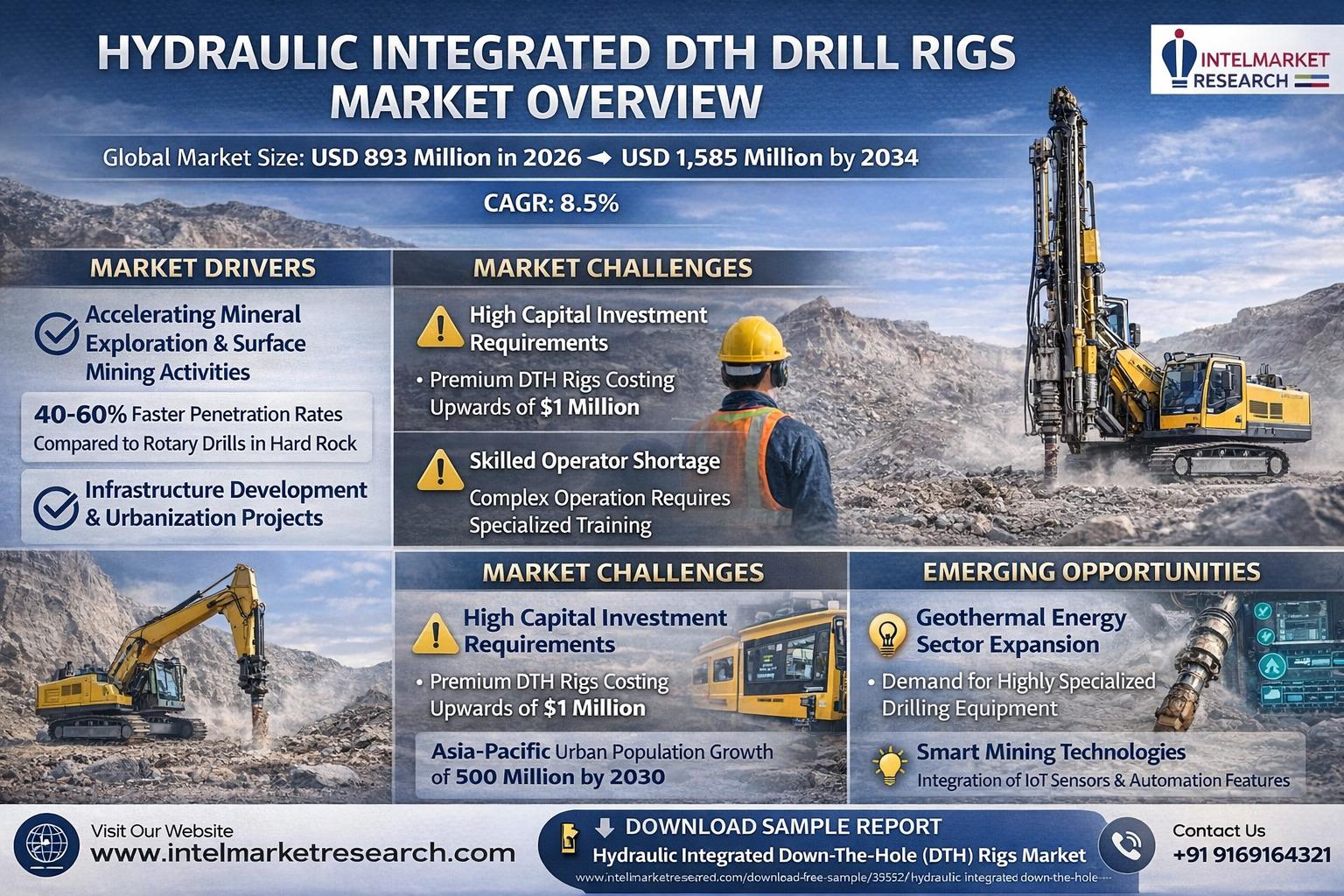 According to a new report from Intel Market Research, Global Hydraulic Integrated Down-The-Hole (DTH) Drill Rigs market was valued at USD 893 million in 2026 and is projected to reach USD 1,585 million by 2034, growing at a steady CAGR of 8.5% during the forecast period (2026-2034). This growth trajectory reflects the expanding mining sector and infrastructure development projects worldwide that demand efficient hard-rock drilling solutions.