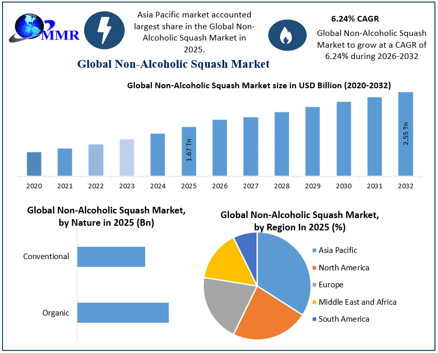 The global Non-Alcoholic Squash Market is witnessing significant growth as consumers increasingly shift toward healthier beverage alternatives that offer refreshing flavors and nutritional value. According to recent industry analysis, the market was valued at USD 1.67 trillion in 2025 and is projected to grow at a compound annual growth rate (CAGR) of 6.24% from 2025 to 2032, reaching nearly USD 2.55 trillion by 2032. The rising focus on health, growing demand for natural ingredients, and expanding availability of fruit-based beverages are expected to drive substantial market expansion during the forecast period.
