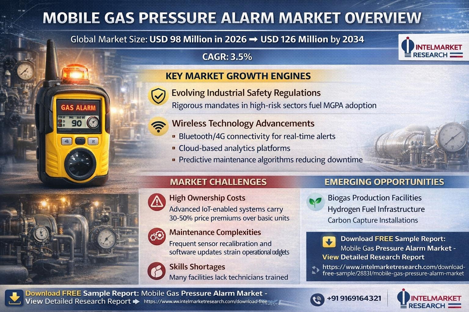 According to new market intelligence from Intel Market Research, Global Mobile Gas Pressure Alarm market reached USD 98 million in 2026 and is forecast to expand to USD 126 million by 2034, delivering steady growth at a 3.5% CAGR through the decade. This expansion reflects mounting industrial safety mandates and accelerating IoT adoption in hazardous environment monitoring.