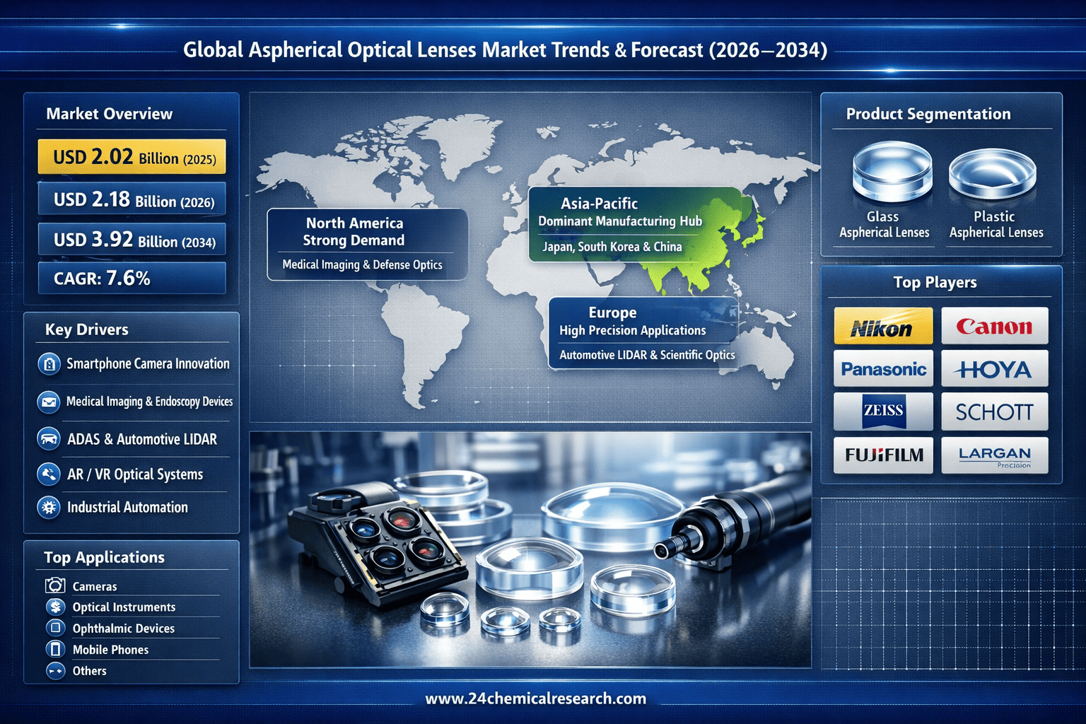 According to 24Chemical Research, Global Aspherical Optical Lenses market size was valued at USD 2.02 billion in 2025 and is projected to grow from an estimated USD 2.18 billion in 2026 to USD 3.92 billion by 2034, exhibiting a CAGR of 7.6% during the forecast period.
