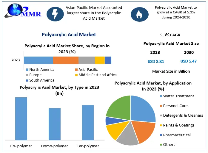 The global Polyacrylic Acid Market is witnessing steady growth driven by increasing demand across multiple industries such as water treatment, detergents, personal care, and pharmaceuticals. According to recent market research insights, the global polyacrylic acid market is projected to reach US$ 5.47 billion by 2030, growing at a compound annual growth rate (CAGR) of 5.3% during the forecast period 2024–2030. The market was valued at US$ 3.81 billion in 2023, reflecting strong demand for water-soluble polymers and advanced chemical solutions.
