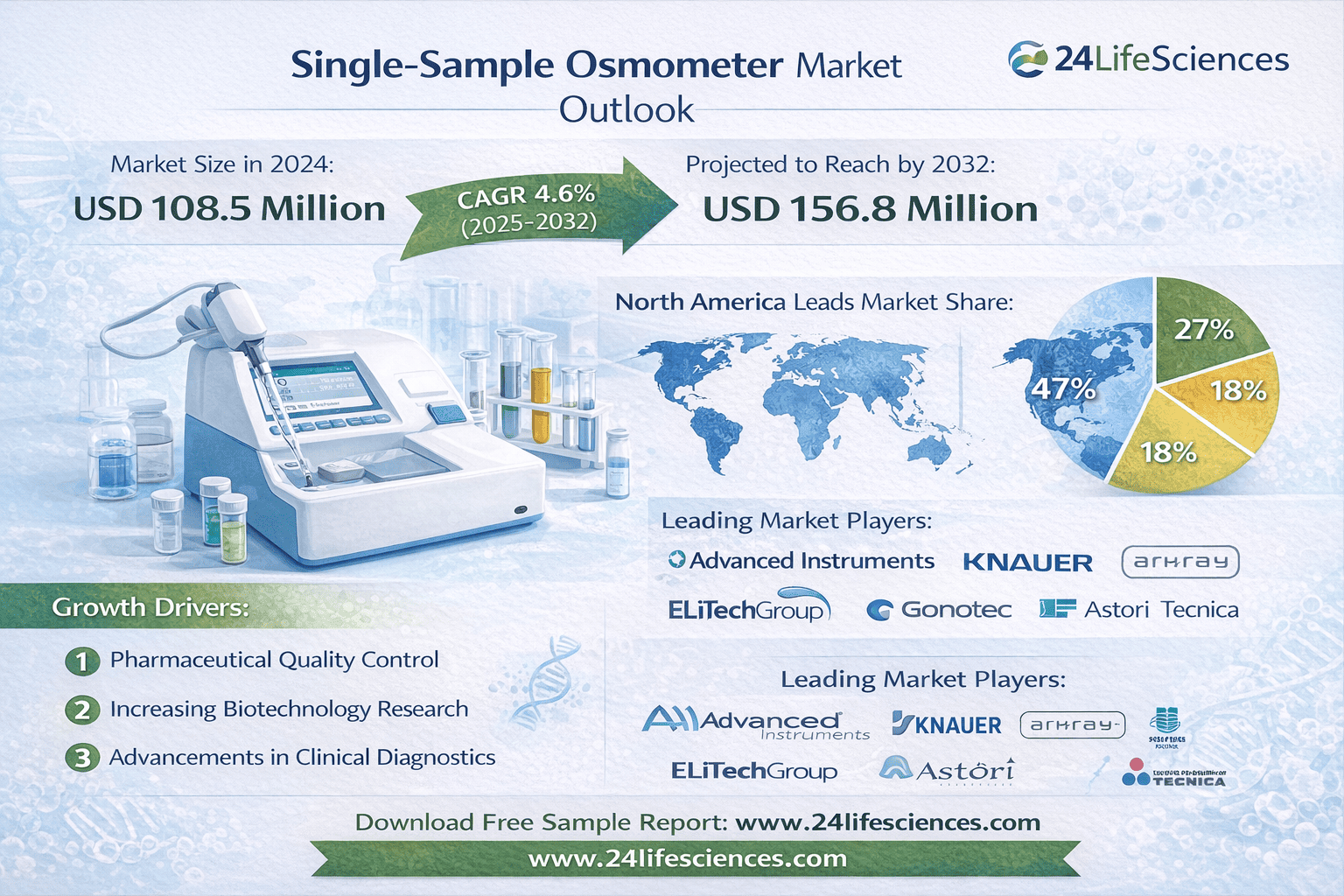 According to a newly published market research report by 24LifeSciences, global single-sample osmometer market was valued at USD 108.5 million in 2024 and is projected to reach USD 156.8 million by 2032, growing at a compound annual growth rate (CAGR) of 4.6% during the forecast period 2025–2032.