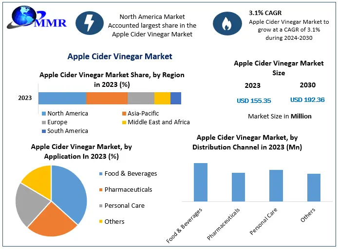 The global Apple Cider Vinegar (ACV) Market has emerged as a key segment within the health and wellness industry, valued at US$ 155.35 million in 2023 and projected to grow at a CAGR of 3.1% from 2024 to 2030, reaching approximately US$ 192.36 million. Apple cider vinegar, produced through the fermentation of apple sugars with yeast, bacteria, or carbohydrates, contains beneficial organic acids, including acetic, lactic, citric, and malic acids. Its consumption has been linked to multiple health benefits, including blood sugar management, weight loss, improved heart health, detoxification, and digestive relief.