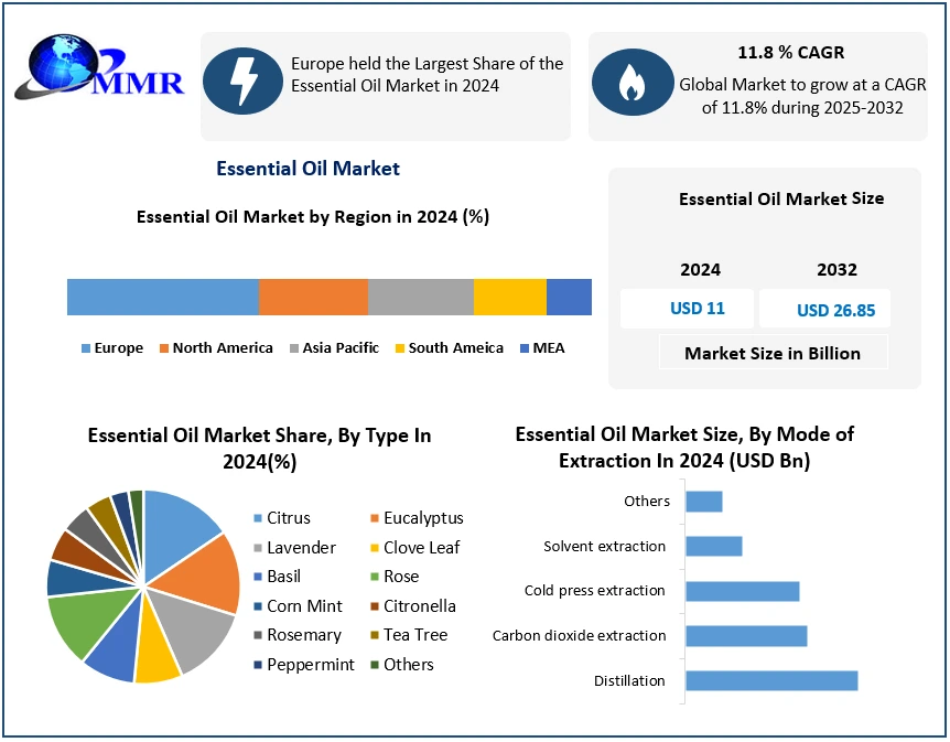 The global Essential Oil Market continues to gain significant momentum as industries and consumers increasingly shift toward natural and plant-based solutions for health, wellness, and product formulation. According to recent market analysis, the Essential Oil Market was valued at USD 11 billion in 2024 and is projected to grow at a CAGR of 11.8% from 2025 to 2032, reaching approximately USD 26.85 billion by 2032.
