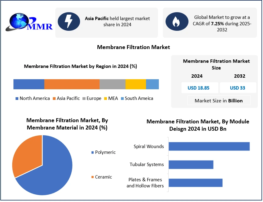 The global Membrane Filtration Market is gaining strong momentum as industries worldwide prioritize water sustainability, product purity, and regulatory compliance. Valued at USD 18.85 billion in 2024, the market is projected to grow at a CAGR of 7.25% from 2025 to 2032, reaching nearly USD 33 billion by the end of the forecast period. This impressive growth trajectory reflects the rising adoption of advanced separation technologies across municipal, industrial, and commercial applications.