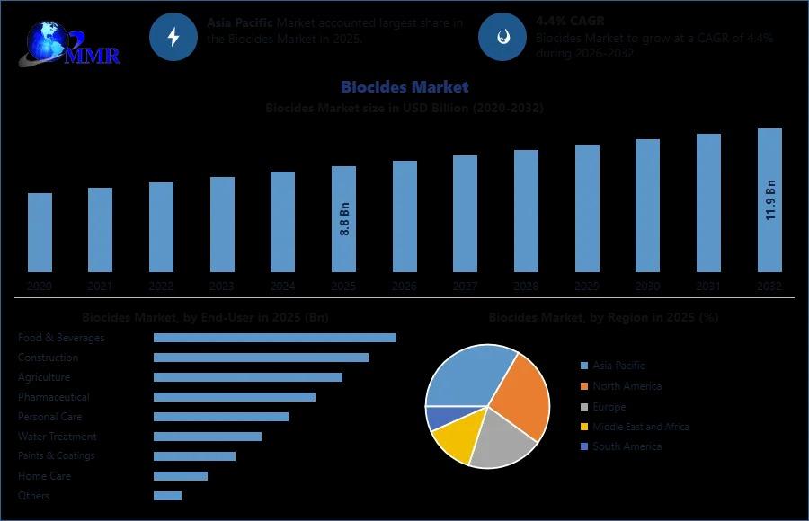 Anticipated Growth in Revenue: The Biocides Market Size was valued at USD 8.8 Billion in 2025 and the total Biocides revenue is expected to grow at a CAGR of 4.4% from 2026 to 2032, reaching nearly USD 11.9 Billion in 2032