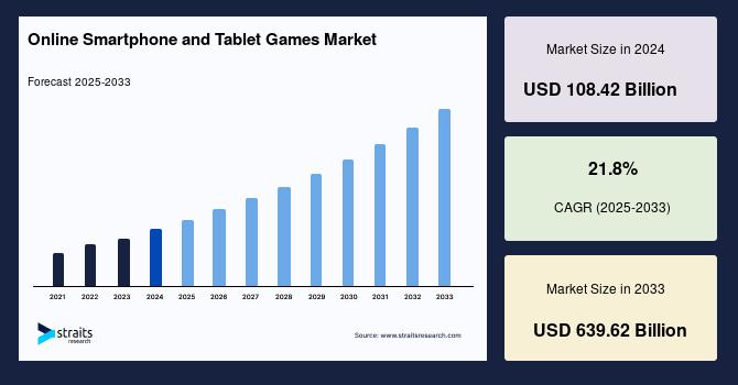 According to StraitsResearch, the global online smartphone and tablet games market size was valued at USD 108.42 billion  in 2024 and is estimated to reach USD 639.62 billion by 2033, growing at a CAGR of 21.8% during 2025-2033.