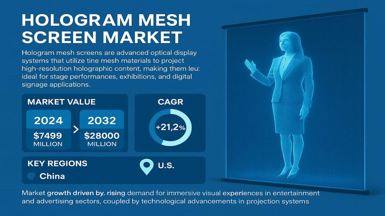 Global Hologram Mesh Screen Market was valued at USD 7,499 million in 2026 and is projected to reach USD 28,000 million by 2034, expanding at a strong CAGR of 21.2% during the forecast period 2026–2034. Rapid adoption of immersive display formats across stage production, exhibitions, museums, and next-generation digital signage is reshaping how brands and event organizers deliver visual experiences.