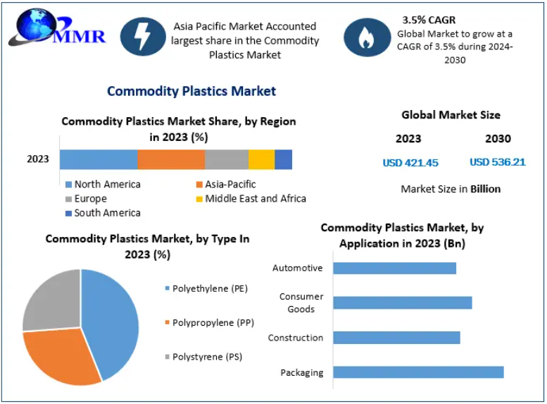 The global Commodity Plastics Market continues to represent the backbone of the modern plastics industry, supplying essential materials used across packaging, construction, consumer goods, automotive, electronics, textiles, and healthcare. Valued at US$ 421.45 billion in 2023, the market is projected to reach US$ 536.21 billion by 2030, expanding at a compound annual growth rate (CAGR) of 3.5% during the forecast period.
