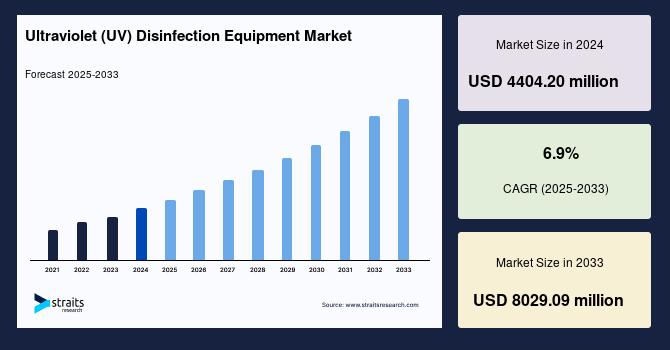 According to StraitsResearch, the global ultraviolet disinfection equipment market size was valued at USD 4404.20 million in 2024 and is estimated to reach USD 8029.09 million by 2033, growing at a CAGR of 6.9% during 2025-2033.