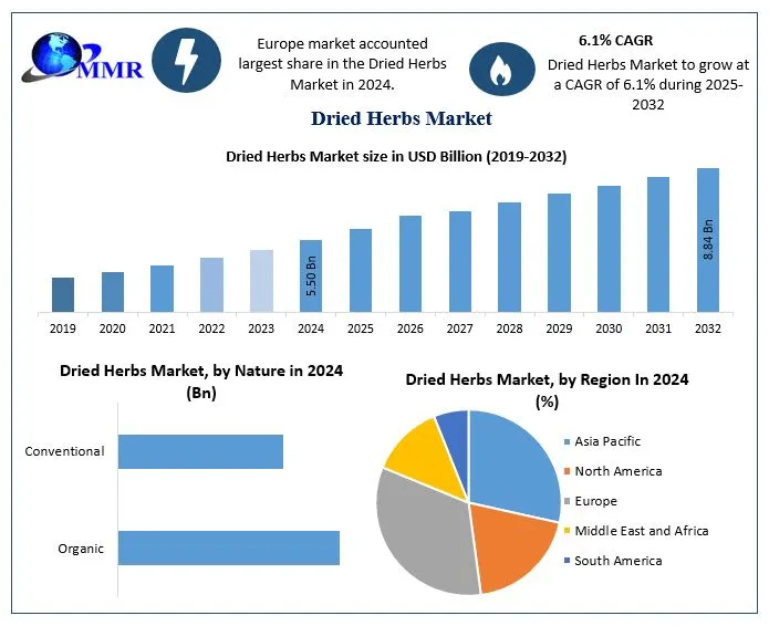 The global Dried Herbs Market is witnessing steady and resilient growth, underpinned by rising demand for processed and convenience foods, increasing awareness of natural and organic ingredients, and the expanding use of herbs across food, pharmaceutical, cosmetic, and personal care industries. Valued at USD 5.50 Billion in 2024, the market is expected to grow at a CAGR of 6.1% from 2025 to 2032, reaching nearly USD 8.84 Billion by 2032.