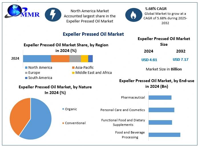 According to recent industry analysis, the global Expeller Pressed Oil Market was valued at USD 4.61 billion in 2024 and is projected to grow at a compound annual growth rate (CAGR) of 5.68% from 2025 to 2032, reaching approximately USD 7.17 billion by 2032. The market’s steady growth reflects changing consumer preferences, advancements in oil extraction technologies, and expanding applications across food, personal care, and pharmaceutical industries.
