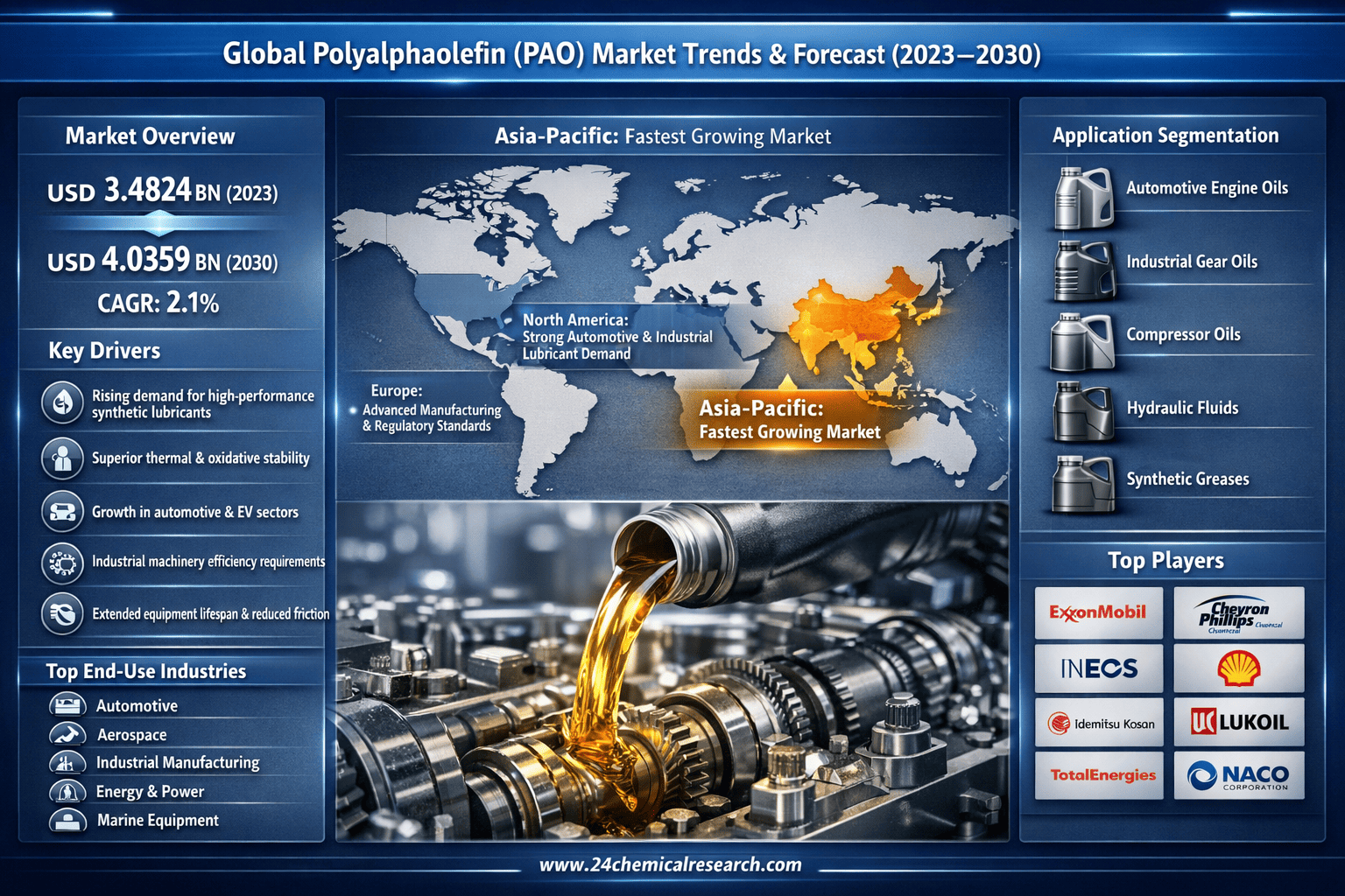 According to 24Chemical Research, Global Polyalphaolefin (PAO) market was valued at USD 3.4824 billion in 2023 and is projected to reach USD 4.0359 billion by 2030, exhibiting a steady CAGR of 2.1% during the forecast period.