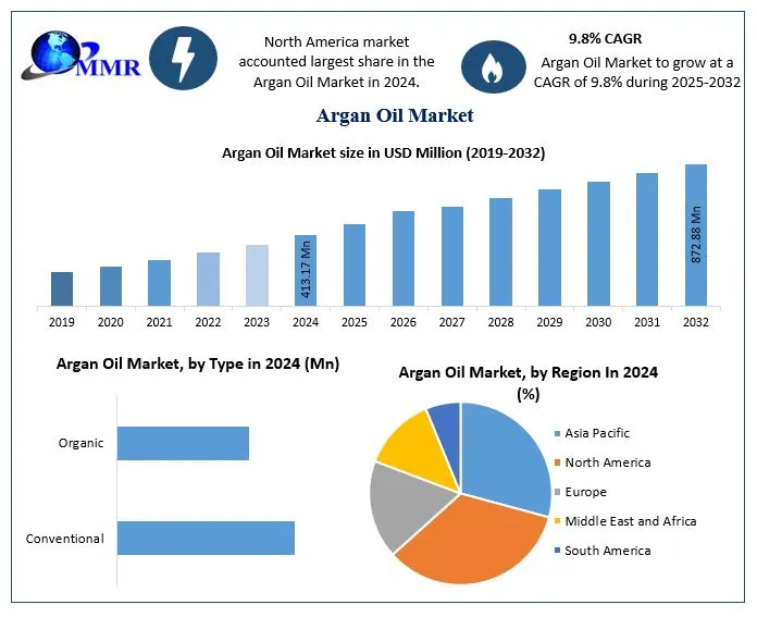 The global Argan Oil Market continues to gain remarkable traction as consumers worldwide increasingly prioritize natural, sustainable, and multifunctional ingredients across personal care, wellness, and food applications. Often described as “liquid gold,” argan oil has evolved from a regionally treasured resource into a globally recognized premium ingredient. According to industry analysis, the Argan Oil Market was valued at USD 413.17 Million in 2024 and is projected to expand at a CAGR of 9.8% from 2025 to 2032, reaching nearly USD 872.88 Million by 2032. This robust growth trajectory reflects rising awareness of argan oil’s health benefits, expanding cosmetic applications, and the growing demand for ethically sourced, bio-based products.