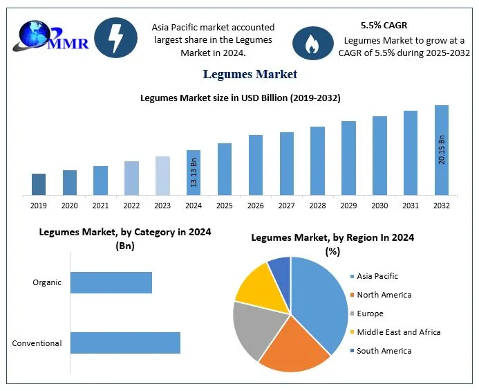 The global Legumes Market is gaining remarkable momentum as consumers, food manufacturers, and agricultural stakeholders increasingly recognize legumes as a cornerstone of nutrition, sustainability, and food security. Valued at USD 13.13 billion in 2024, the global legumes market is projected to expand at a compound annual growth rate (CAGR) of 5.5% from 2025 to 2032, reaching an estimated USD 20.15 billion by 2032. This growth reflects shifting dietary preferences, rising demand for plant-based protein, and the expanding application of legumes across food, feed, pharmaceutical, and industrial sectors.