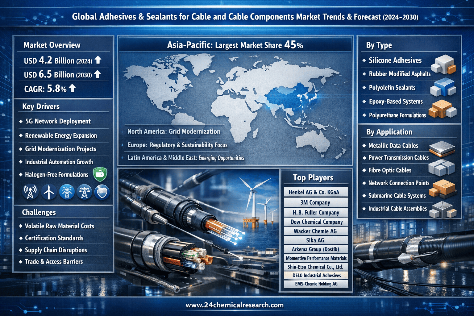 According to 24Chemical Research, Global Adhesives and Sealants for Cable and Cable Components Market is experiencing robust growth, with a valuation reaching USD 4.2 billion in 2024. According to comprehensive market analysis, this sector is projected to expand at a CAGR of 5.8%, achieving an estimated USD 6.5 billion by 2030. This upward trajectory is fueled by escalating demand in telecommunications, energy infrastructure, and consumer electronics, particularly in rapidly developing economies where digital transformation and urbanization are accelerating cable deployment.