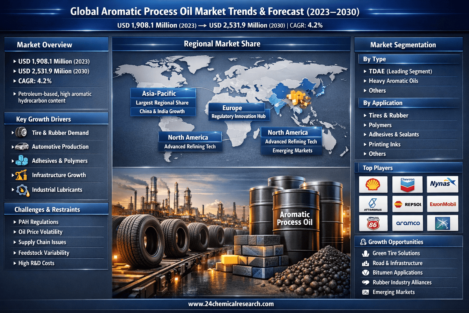 According to 24Chemical Research, Global Aromatic Process Oil market was valued at USD 1908.1 million in 2023 and is projected to reach USD 2531.9 million by 2030, exhibiting a steady CAGR of 4.2% during the forecast period.