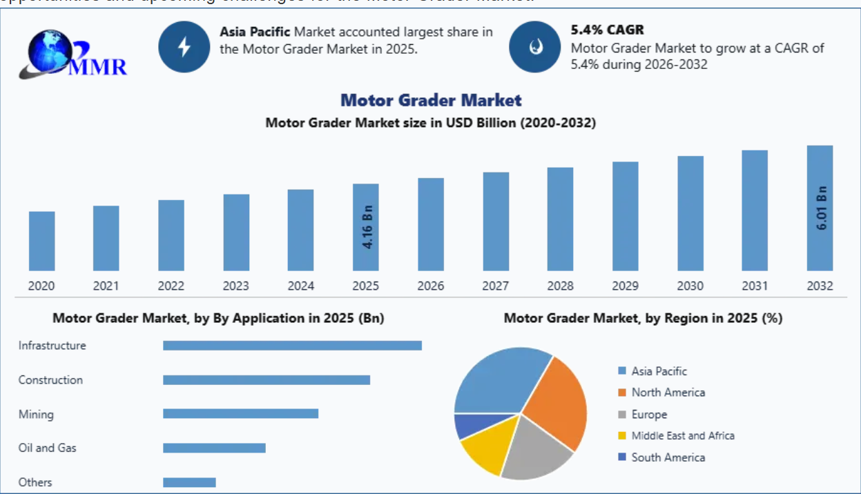 Global Motor Grader Market was valued at USD 4.16 Billion in 2025, and is expected to reach USD 6.01 Billion by 2032, exhibiting a CAGR of 5.4% during the forecast period (2026-2032)