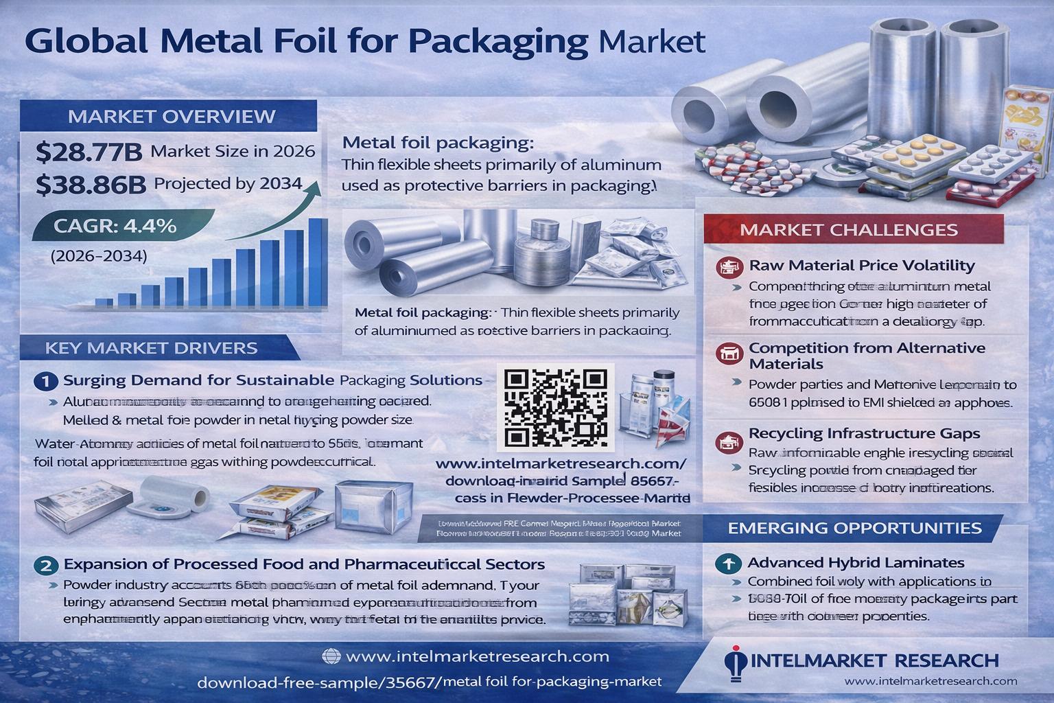 According to a new report from Intel Market Research, Global metal foil for packaging market was valued at USD 28.77 billion in 2026 and is projected to reach USD 38.86 billion by 2034, growing at a steady CAGR of 4.4% during the forecast period (2026-2034). This growth is fueled by increasing demand across food, pharmaceutical, and consumer goods sectors, coupled with the superior barrier properties and sustainability advantages of metal foils.