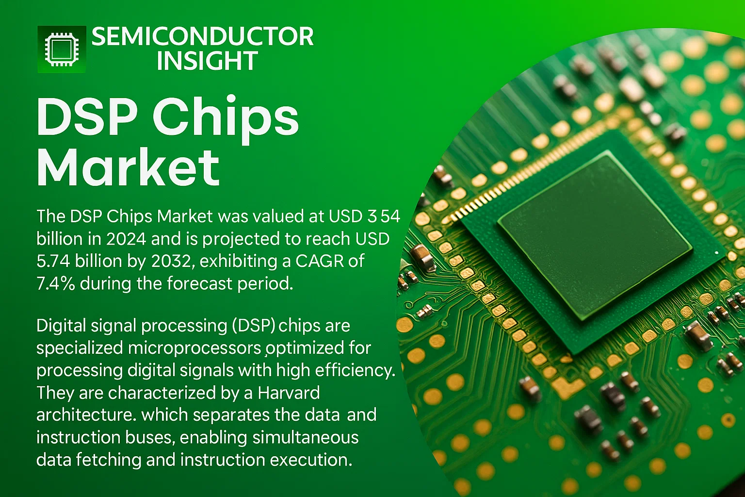 Global DSP Chips Market size was valued at USD 3.54 billion in 2025. The market is projected to grow from USD 3.80 billion in 2026 to USD 5.74 billion by 2034, exhibiting a CAGR of 7.4% during the forecast period (2026-2034). This steady expansion tracks rising real-time signal processing needs across telecommunications and automotive systems.