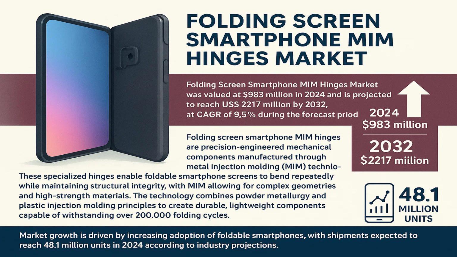 The market covers MIM-fabricated hinge assemblies for flexible OLED smartphones, from powder mixing to functional testing excluding displays. Dynamics feature 48M unit shipments in 2024 scaling to 100M+ by 2030 amid 68% APAC capacity concentration and durability specs evolving to 500k cycles.