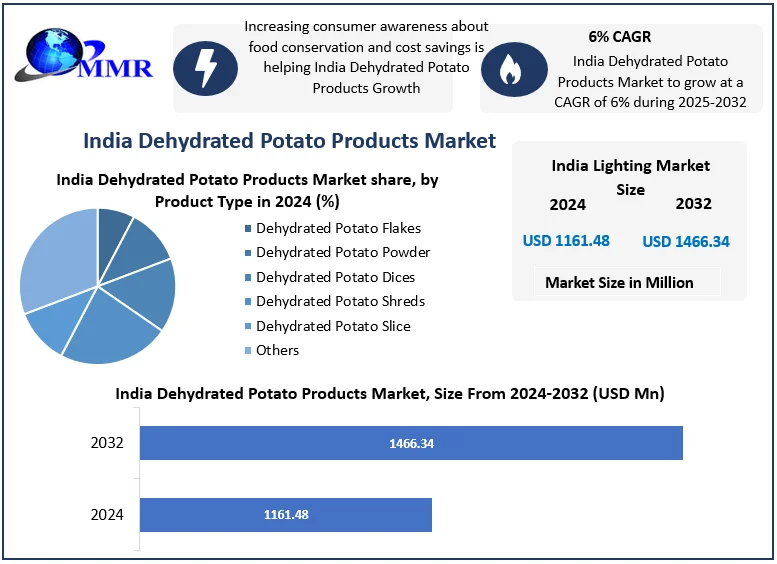 The India Dehydrated Potato Products Market, valued at USD 1,161.48 million in 2024, is projected to grow at a CAGR of 6% during 2025–2032, reaching nearly USD 1,466.34 million by 2032. The market’s growth is fueled by rising consumer demand for convenient, nutritious, and versatile food ingredients, coupled with increasing adoption in both domestic and international food industries. The study also reflects the revenue impact of the COVID-19 pandemic on market leaders, followers, and disruptors, providing a holistic view of current and future trends.